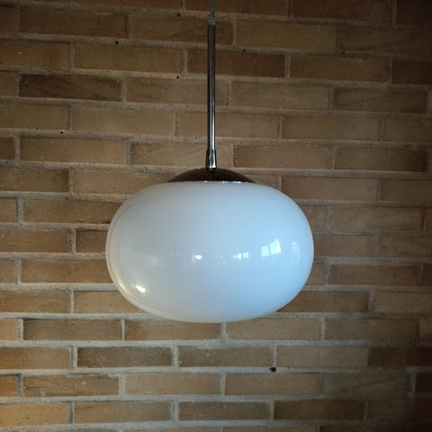 Louis Poulsen pendel lampe i hvidt glas, vintage model fra 1940’erne i 33cm, designet af Wilhelm Lauritzen. Lampen har en rund, lukket skærm med åbning i bunden og fatning i midten til lyskilde. Ophængt i ledning fra toppen, velegnet som loft- eller spisebordsbelysning. Klassisk glaspendel, der giver et diffust og behageligt lys gennem den hvide glasskærm.