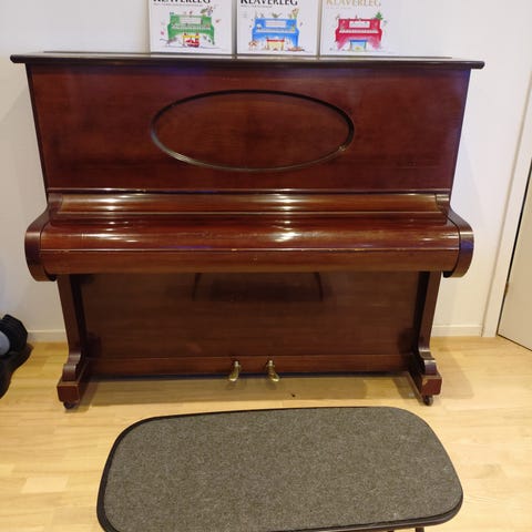 Opretstående klaver i træfinish med tilhørende polstret bænk. Klaveret har fuldt klaviatur. Bænken har polstret sæde og træben, som matcher klaverets stil.