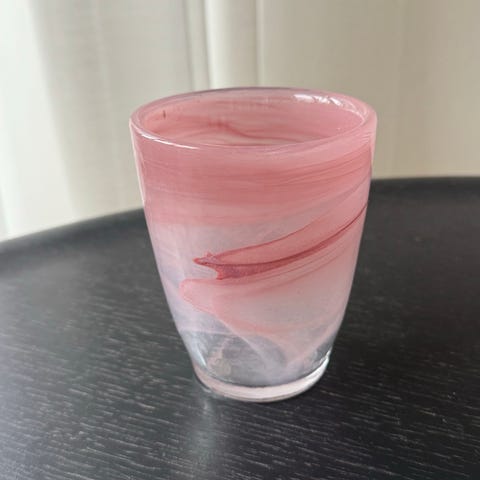 Hay skål i lyserødt glas. Skålen har et transparent udtryk med lyserøde, hvirvlende detaljer i glasset.