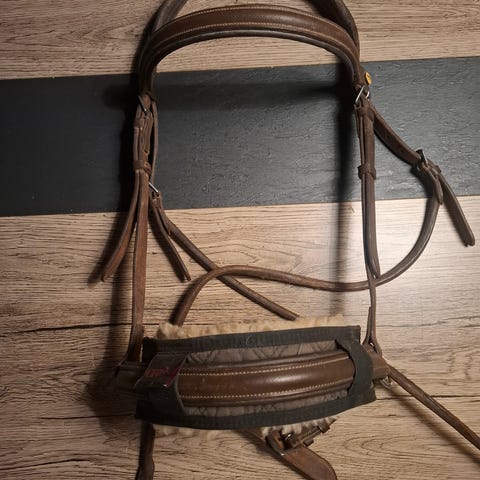 Den er brugt, men fremstår i god stand. Lammeskind til næsebånd/nakkebånd medfølger.