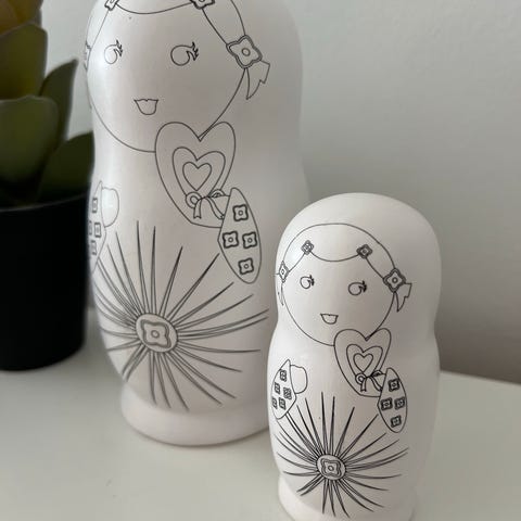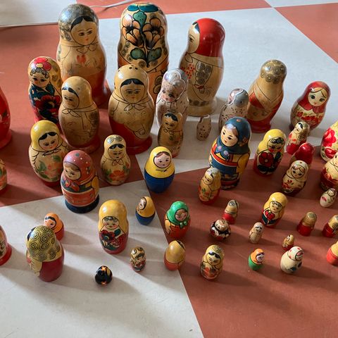 5 babuska figurer. Den store er lysere end dem indeni - nok pga. lys. Men fremstår ellers fine. Den store måler ca. 18 cm.