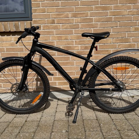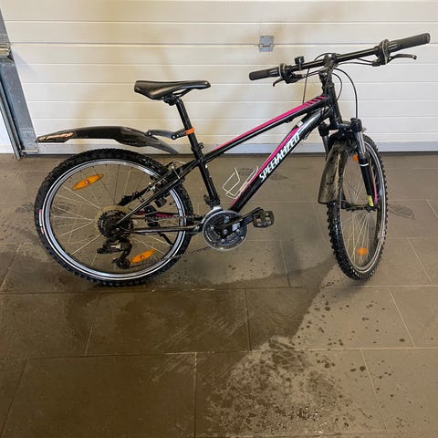 Børnecykel med 24" hjul i sort/rød. Cyklen har mountainbike-inspireret stel og dæk med mønster, der egner sig til både vej og lettere terræn. Den trænger til en kærlig hånd, da der er flere ting på den der skrænter. Derfor den billige pris.