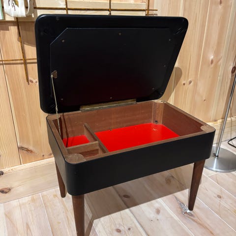 En lille skammel i sort læder på teak ben. Låget er i bordeaux farvet læder. I okay stand med plads til i det røde rum.