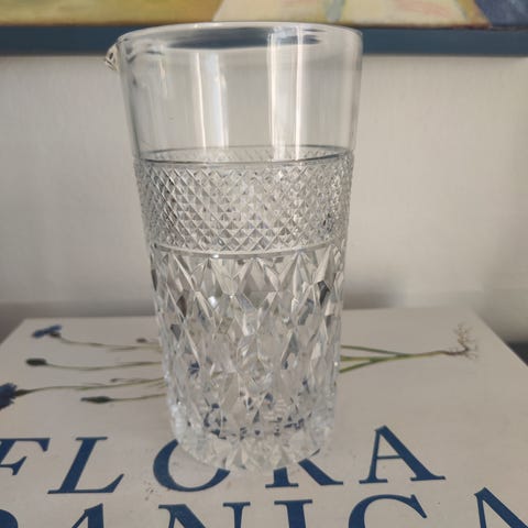 Kosta Boda kande i glas med sort/hvidt stribet mønster. Kanden har hank og hældetud og er egnet til servering af kolde drikke.