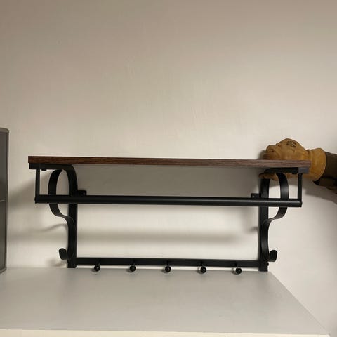 Hattehylden har både stang til bøjler og 6 knager forneden til jakker. Skohylden matcher stilen og er i fin stand.