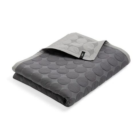 HAY Mega Dot 120x160 tæppe i blå farve med quiltet cirkelmønster. Tæppet har synlige stikninger og kantbånd hele vejen rundt samt lille Hay-mærke i kanten. Velegnet som plaid i stuen, på sengen eller som ekstra tæppe i hjemmet.