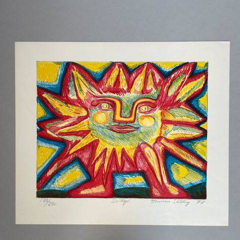 Herman Stilling “trold med grøn hue” litografi med figurmotiv i grønne og blå nuancer. Trykket viser en stående figur med grøn hat på blå baggrund. Signeret og dateret 1977 samt nummereret 98/220.