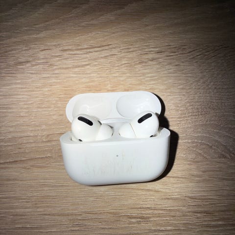 Apple AirPods Pro høretelefoner i hvid med trådløs forbindelse. In-ear design med silikone-eartips i flere størrelser for bedre pasform. Leveres med opladningsetui, der beskytter og oplader høretelefonerne. Vigtigt er, at selve AirPodsne ikke virker særligt godt - de kan godt spille musik, men skratter. Men case virker som det skal. Så hvis du enten kan finde ud af at reparere, eller mangler et nyt case, er dette en god løsning.