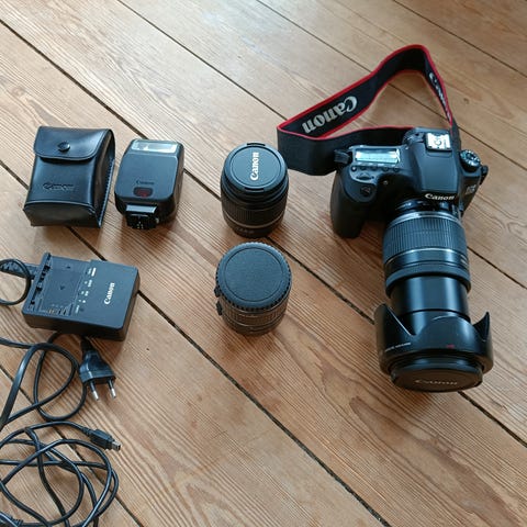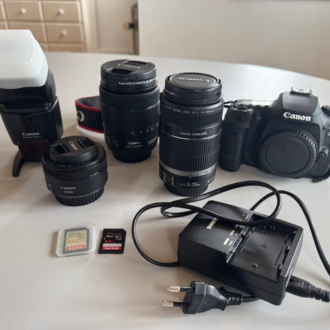 Canon EOS 90D spejlreflekskamera med Canon 18-55mm zoomobjektiv i sort. Kameraet er et digitalt spejlreflekskamera (DSLR), velegnet til både foto og video. Objektivet har variabel brændvidde fra 18 til 55mm, hvilket dækker vidvinkel til kort tele og gør det egnet til f.eks. landskaber, portrætter og hverdagsfotografering.