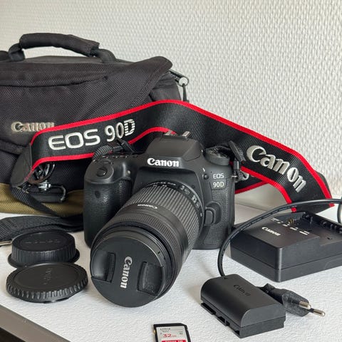 Sættet på billederne omfatter kamerahus, 18-55mm objektiv, objektivdæksel, oplader med strømkabel, manual til EOS 90D samt et stativ. Kameraet har indbygget blitzsko til montering af ekstern flash eller andet tilbehør og flere knapper og hjul til manuel indstilling af eksponering og andre funktioner.