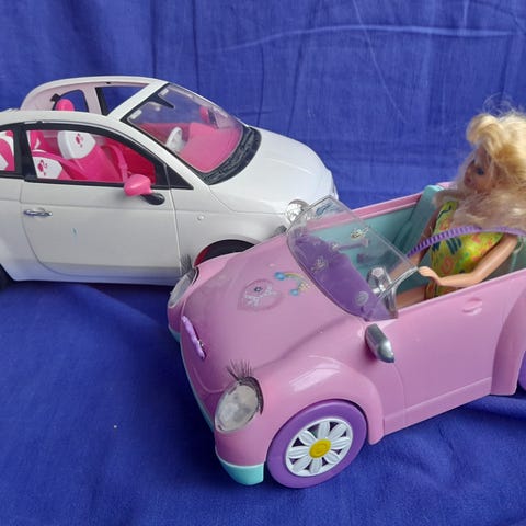 bil og ting man kan ligge sammen, bilen har døre der kan åbnes og lukkes og en bagage men uden barbie dukker