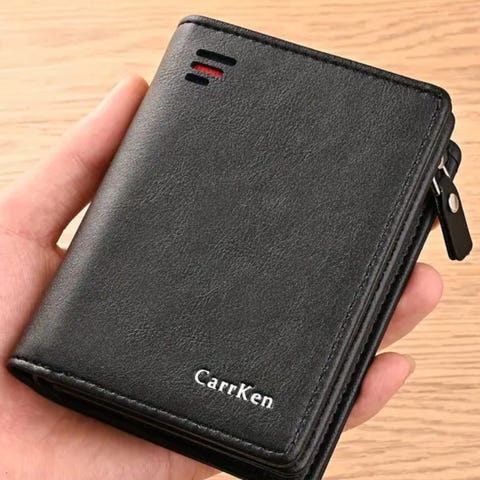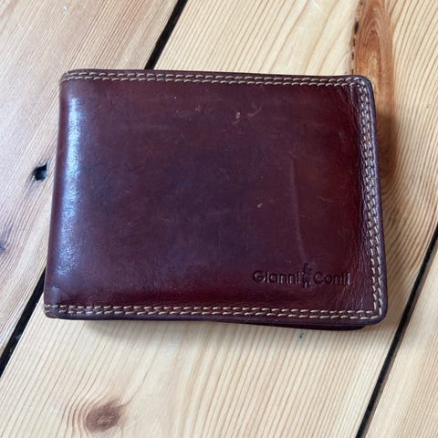 Der er plads til 5 kort og rum til mønter. Jeg er i tvivl, om det er læder.