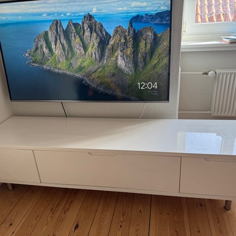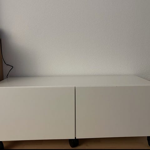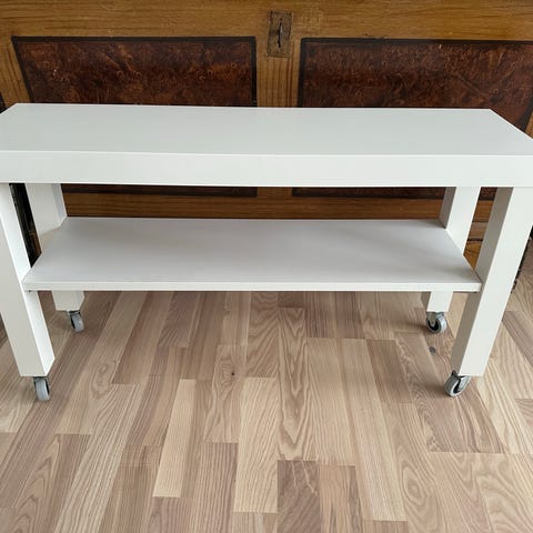 Hvid tv bord på hjul med åben hylde og skuffe. Reolen har en åben opbevaringshylde øverst og en skuffe nederst til lukket opbevaring. Den står på fire hjul, som gør den let at flytte rundt. Velegnet som lille tv-bord eller ekstra opbevaring i stue, værelse eller kontor.