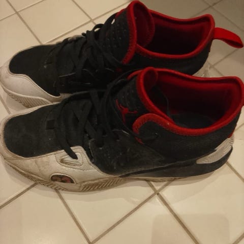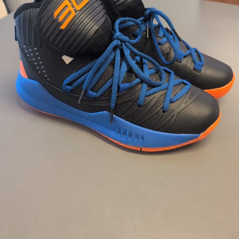 Basketballsko i sort og lilla farvekombination. Modellen har høj ankelstøtte, snørelukning kombineret med velcrostrop over vristen samt mønstret gummisål. Overdelen er i syntetisk materiale med perforerede detaljer ved anklen. Velegnet som indendørs basketsko. Størrelse fremgår af mærkatet på indersiden af skoen - str 41.