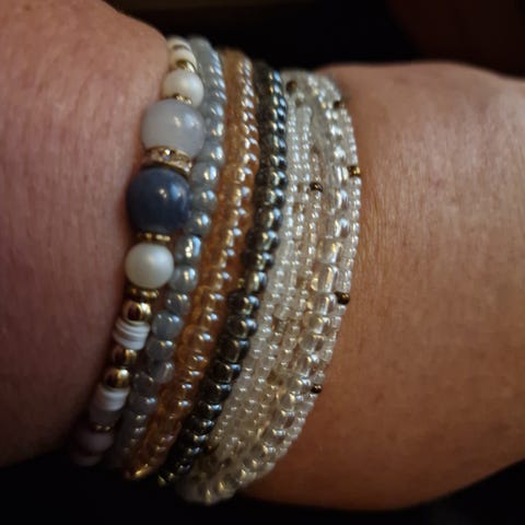Let, livligt og fuld af personlighed. Disse armbånd er håndlavede af små glasperler i Vestafrika og er perfekte til både hverdag og sommer.
