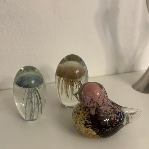 Glas papirvægte med vandmand motiv i klar glas med grønne og blå detaljer. Sættet består af to ovale papirvægte med indlagt dekoration, der forestiller vandmænd med tentakler i forskellige nuancer af grøn og blå. Papirvægtene er massive og gennemsigtige, så motivet kan ses fra alle sider. Velegnet som borddekoration eller til at holde styr på løse papirer.