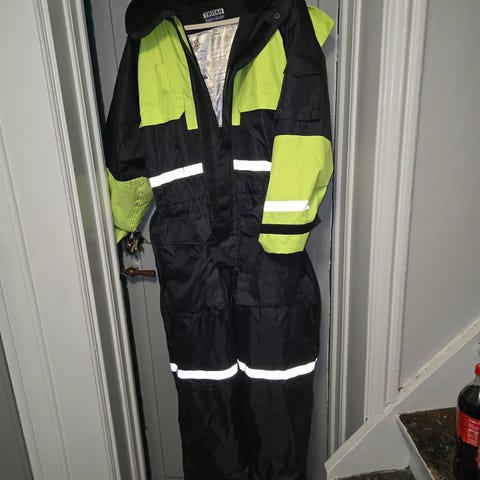 Aalesund Oljeklede Koltsnes kemikaliedragt i størrelse XL. Dragten er i grøn farve og designet som heldragt med hætte, som vist på emballagens skitse. Egnet til arbejde, hvor der er behov for kemikaliebeskyttelse i industri- eller rengøringsmiljøer. Dragten følger EN 340-standard for beskyttelsesbeklædning ifølge mærkningen på pakken.