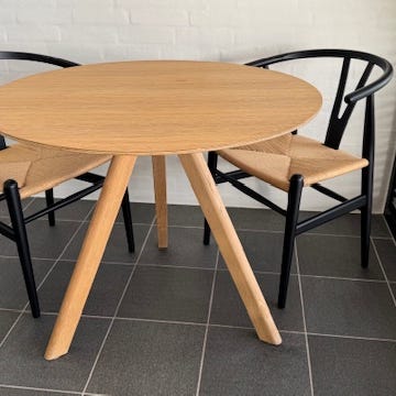 Smukt Hay bord i hvidt laminat og ben i eg. Fejler ingenting. Der kan nemt sidde 4 personer ved bordet, lidt tæt 5.