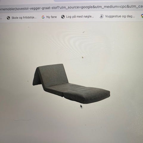 Grå sovestol 'Skillebekk' fra Jysk, der ikke føres længere. En behagelig lænestol, der meget nemt kan foldes ud som seng med liggemål 68x195 cm. Den er kun brugt som seng tre gange, men det fungerer fint - en ideel gæsteseng, der ikke fylder til daglig.