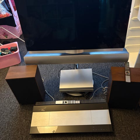 Bang & Olufsen Beovision tv med tilhørende Beolab gulvhøjttalere og Beosound anlæg.