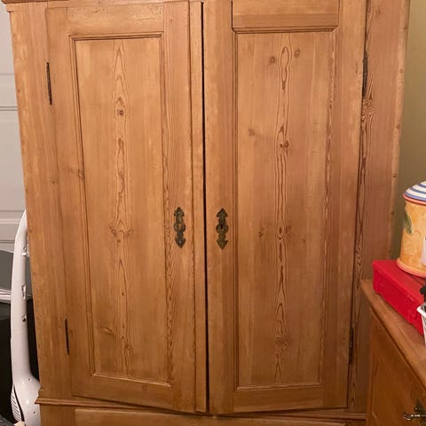 Karlekammerskab. Der er et stort rum med bøjleplads og to gode skuffer. Har været i familien i 50+ år, men nu trænger jeg til noget luftigere. Der er slået et stykke af hjørnet - kan ses på billedet. Det trænger til en afsyring eller en ny omgang maling.