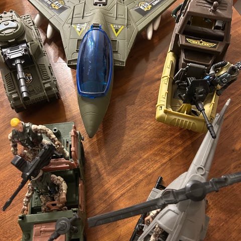 Militær legetøjssæt med kampfly, helikopter, båd og forskellige militære køretøjer samt tilhørende soldaterfigurer og udstyr. Sættet indeholder flere dele, der kan bruges til at lege forskellige militære scenarier på gulv eller bord. Velegnet til børn, der kan lide action- og krigslege med køretøjer og figurer.