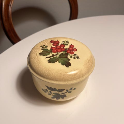 Aluminia markeladekrukke med låg. Dekoreret med jordbærmotiv og grønne blade på låg og sider. Fremstillet i stentøj/keramik med glasur. Krukken er en del af samling af marmeladekrukker fra Tidemanns Tappel og Marmeladefabrik. Denne er fremstillet i anledning af julen 1928. Fremstår i flot stand. Kan sendes for købers regning.