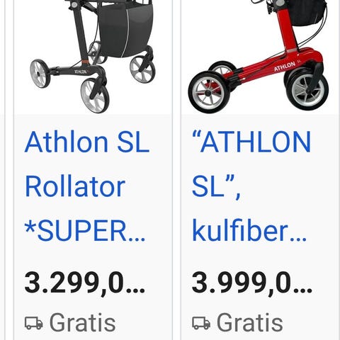 Athlon SL rollator i letvægts kulfiber i farven sort. Rollatoren har en egenvægt på ca. 5,2 kg og er fremstillet i kulfiber (carbon). Den er godkendt til brugervægt op til 150 kg.