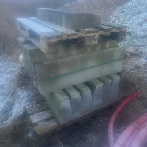 Betonblokke / Funda blokke / hulsten i grå beton. Blokkene har gennemgående hulrum og er velegnede til mure, fundamenter, støttemure eller andre bygge- og anlægsopgaver. Leveres som viste blandede elementer på paller, kan hjælpe med læsning. Der er 2-2,5 palle. sælges kun samlet