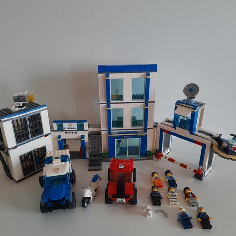 Politistation. Lego 60210. Enkelte af de hvide overflader er let falmet. Den røde bil mangler. Alle samlevejledninger medfølger.
