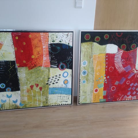 Ukendt kunstner abstrakte malerier sæt flerfarvet. Sættet består af to rektangulære lærreder i ramme med stiliserede ansigter udført i et grafisk, geometrisk udtryk. Motiverne er opdelt i felter med kraftige sorte konturer og klare farver som rød, gul, blå, turkis, rosa, grå og hvid. Malerierne er velegnede som vægdekoration i stue, gang eller kontor og kan hænge samlet som sæt eller hver for sig.