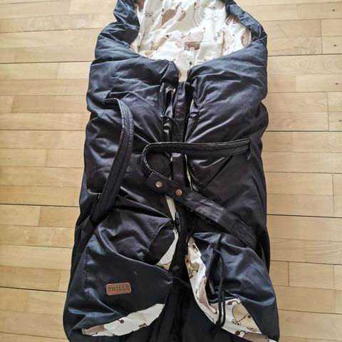 Trille kørepose i grå denim look med tilhørende bæreplade. Køreposen har hætte og snorelukning for justering omkring barnets hoved. Indersiden fremstår mørk og blød for øget komfort. Ydersiden er i slidstærkt materiale, egnet til brug i barnevogn eller klapvogn, da der er huller til klapvognssele. Bærepladen kan fastgøres i køreposen for nem håndtering af barnet. Velegnet til brug i de køligere måneder.