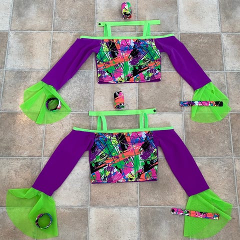 Discodragt, helt nye lycra duotoppe uden glimmer fra Discodragter.dk, str. 8-10 år ca. Safari-mønstret forstykke, lilla ryg og coralfarvede ærmer med tyndt net nederst på ærmerne. Sæt selv leggings til.