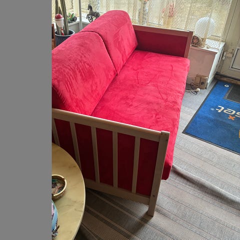 Rød sovesofa, nem at slå ud, måler 1.20 x 2m