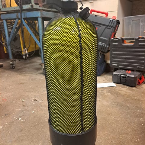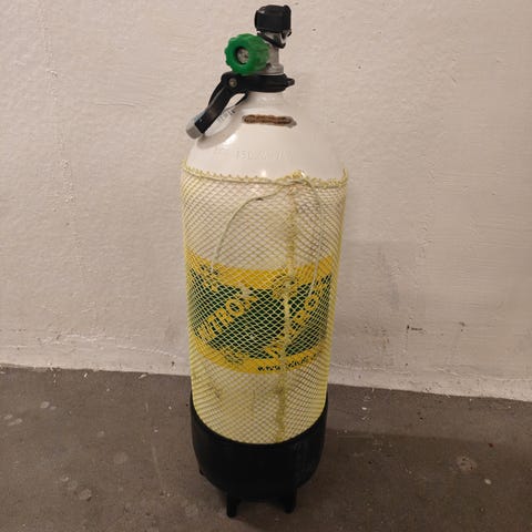 Dykkerflaske 15 liter med net, fod og håndtag. I meget fin stand. Skal trykprøves inden brug.