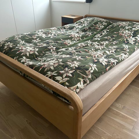 BoConcept seng i lyst træ med hoved- og fodgærde. Sengen har et enkelt, rektangulært design med lige linjer og massive træben. Den egner sig til brug i soveværelse eller gæsteværelse og passer til en standard madrasstørrelse inden for enkeltseng/dobbeltseng afhængigt af mål, som kan oplyses af sælger. Trærammen giver et stabilt underlag for madras og sengebund.