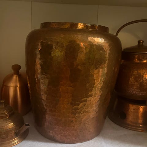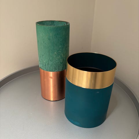 &Tradition vaser i kobberfarvet metal med dekoreret blomster- og mønstret detalje på midterstykket. Vaserne har en udskåret, bølget kant foroven og en klassisk, slank fod. Egnet som dekorative vaser til bord, reol eller vindueskarm i stue, spisestue eller entré.