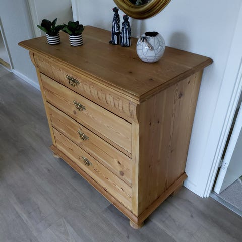 Kommode med 4 fletskuffer i naturfarvet materiale. Rammen er i træ med glat topplade, og skufferne er udført i flettet materiale med skind håndtag på forsiden.