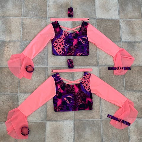 Discodragt, helt nye lycra duotoppe uden glimmer fra Discodragter.dk, str. 8-10 år ca. Penselstrøg-mønstret forstykke, lilla ryg og ærmer (farven hedder hot magenta) med tyndt neongrønt net nederst på ærmerne. Sæt selv leggings til.