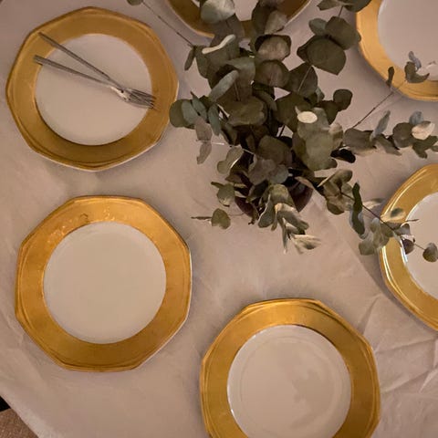 Der findes også en soveskål, men den er der skår i, så den følger med. Der er også skår i en af middagstallerknerne, så den koster heller ikke noget. Middagstallerkner og dybe tallerkner er let slidte. Resten fremstår som nyt.