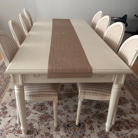 Vi sælger kun bordet, da familien er forøget med 4 (snart 5) børnebørn, og derfor har brug for et større bord 😊