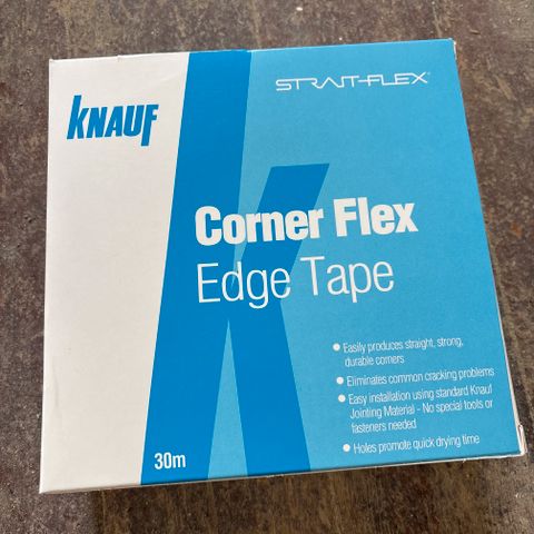 Knauf Strait-Flex Corner Flex edge tape er en kant- og hjørnetape til gips- og vægkonstruktioner. Rullen indeholder 30 meter hvid tape med forperforerede huller langs kanterne. Produktet anvendes typisk til forstærkning og afslutning af indvendige og udvendige hjørner samt kanter ved spartling og beklædning af vægge og lofter.
