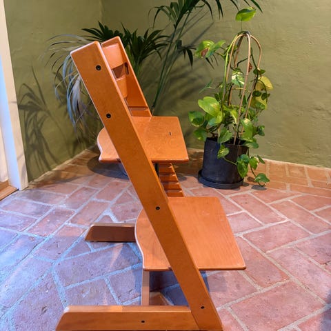 Stokke højstol i træ. Klassisk model med justerbar siddeplade og fodplade, som kan tilpasses barnets højde. Egnet til brug ved spisebord eller som siddeplads til børn. Neutral, lys træfarve, der passer ind i mange typer indretning.