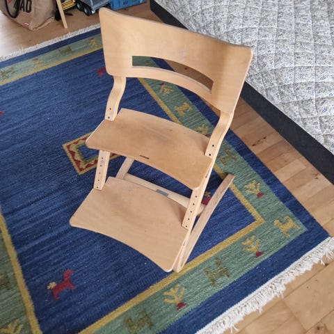 Stokke børnestol i sammenklappeligt design. Stolen monteres på en almindelig spisebordsstol og har sæde i lyst træ samt sorte sidestykker og remme. Udstyret med sikkerhedssele til fastspænding af barnet. Egnet som rejse- eller ekstra spisebordsstol til børn, når der er behov for en kompakt løsning, der kan spændes på en eksisterende stol.