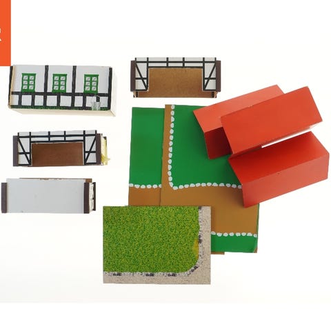 Sættet består af flere små huse med røde tage og vægge i sort/hvidt bindingsværkslook, placeret på en grøn bundplade.