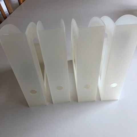 Tidsskriftsamlere i rød plast. Velegnet til opbevaring af blade, mapper eller dokumenter på reol eller skrivebord. Åbne sider og bund med slidser giver ventilation og overblik over indholdet. Højden fremgår af billedet med tommestok. Sælges som sæt, antal som vist på billederne.