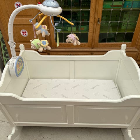 Vugge fra Oliver Furniture i hvidt træ med tremmesider og åbning i front. Vuggen står på runde træben og har læderremme som detaljer på siderne. Madrassen på billederne medfølger efter aftale. Velegnet som soveplads til spædbørn i soveværelse eller børneværelse. Min mand kan evt levere for et lille kørselstillæg og forudbetalt 500kr så han ikke kører forgæves.