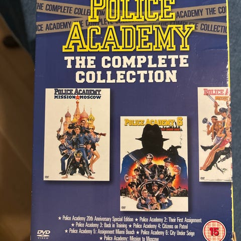 Police Academy The Complete Collection dvd boks. Indeholder hele Police Academy filmserien samlet i én udgivelse. Omslaget viser, at der er tale om en samleboks med flere film i serien. Format: dvd.
