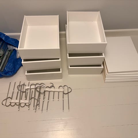 To net skuffer med skruer og udtræk. Én hylde med skruer/holder. Alle tre er til IKEA pax 50x58.