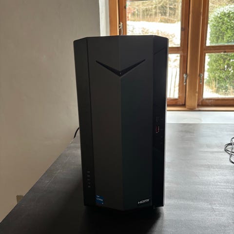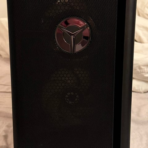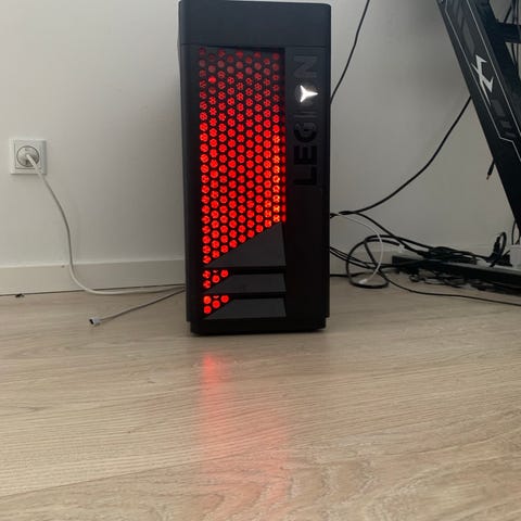Lenovo Legion stationær computer i sort kabinet. Kabinettet har Legion-logo med blå belysning på fronten og diskret Legion-tekst på siden. Der er mærkater på bagsiden, som angiver model- og certificeringsoplysninger samt at enheden er remanufactured af Lenovo. Specifikationerne vises på sidste billede. Computer i god stand og sælges kun da den bare ikke bliver brugt længere